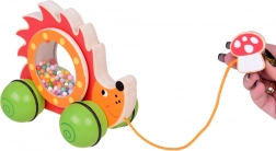 Dzięki szerokiemu rozstawowi kół jeżyk jest stabilny i łatwy w prowadzeniu. Zabawka została wykonana z wytrzymałego drewna i pomalowana bezpiecznymi, nietoksycznymi farbami, dlatego nadaje się także dla najmłodszych odkrywców. Pomarańczowy sznureczek z drewnianym muchomorem ułatwia chwytanie i ciągnięcie.