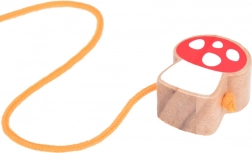 Ergonomiczny sznureczek zakończony drewnianym muchomorem ułatwia chwytanie i prowadzenie zabawki małymi rączkami.