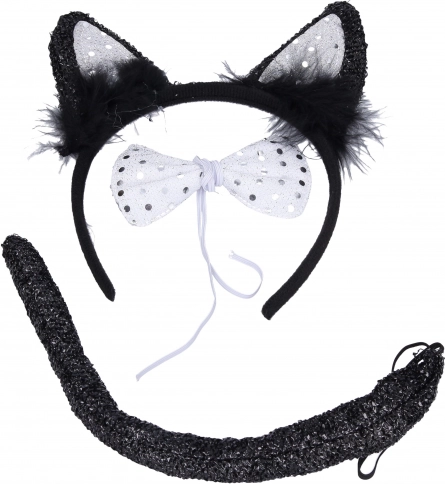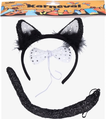Stylowy karnawałowy zestaw dla miłośników kotów zawiera wszystko, czego potrzeba do szybkiej metamorfozy. Znajdziesz w nim opaskę z kocimi uszami, muszkę i ogon – idealne na karnawał, bal przebierańców oraz tematyczne imprezy.
