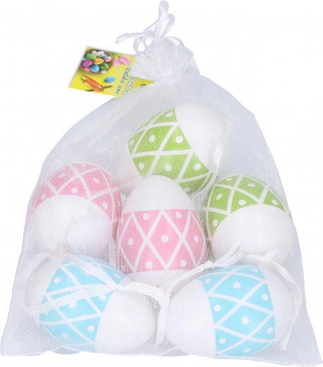 Ozdób swój dom tym zestawem dekoracyjnych plastikowych jajek w różnych kolorach. Doskonale nadają się do wiosennych i wielkanocnych dekoracji. Zestaw zawiera sześć jajek, które są dostarczane w eleganckim woreczku z organzy.
