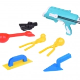 - Kolorowy pistolet WYRZUTNIA pozwala na rzucanie uformowanych śnieżnych kul daleko przed siebie. Włóż śnieżną kulę do lufy, pociągnij i strzelaj.