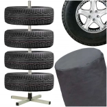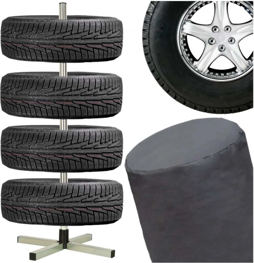 Konstrukcja stojaka wykonana jest z trwałej stalowej ramy, wyposażonej w cztery nogi dla stabilności, nawet przy pełnym obciążeniu. Zestaw zawiera ochronną osłonę, która chroni przechowywane opony przed zabrudzeniami i kurzem.
