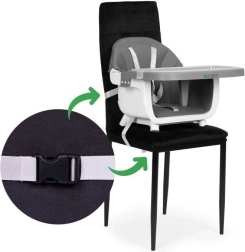Wariant 2 w 1 pozwala zdjąć nogi i bezpiecznie przymocować siedzisko paskami do zwykłego krzesła – idealne w podróży i przy domowym stole.
