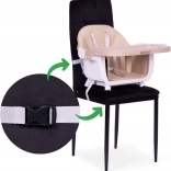 2 sposoby użycia – w domu i w podróży: krzesełko można używać jako klasyczne wysokie krzesełko lub po zdjęciu nóg jako nakładkę na zwykłe krzesło. Pasy mocujące utrzymują siedzisko stabilnie na miejscu, dzięki czemu dziecko bezpiecznie zje posiłek gdziekolwiek.