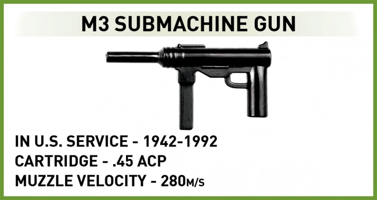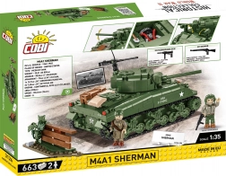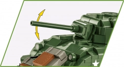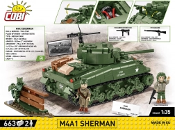 Klocki zawierają funkcjonalne elementy: podwozie gąsienicowe, obrotową wieżę, ruchomą lufę, otwierany właz dowódcy oraz pokrywę serwisową z atrapą silnika. W opakowaniu znajdziesz dwie figurki – amerykańskiego czołgistę z hełmofonem i pistoletem maszynowym M3 „Grease Gun” oraz piechura z karabinem M1 Garand – plus dodatki scenerii, w tym fragment płotu i żywopłotu.
