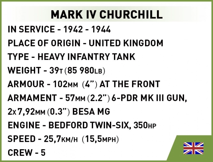 Zbuduj legendarny brytyjski ciężki czołg piechoty MARK IV CHURCHILL w skali 1:35 z 668 wysokiej jakości elementów COBI. Model oferuje funkcjonalne gąsienice, obrotową wieżę, ruchomą lufę oraz otwierany właz. W zestawie znajdują się 2 szczegółowe figurki z bogatymi akcesoriami oraz wysokiej jakości nadruki, które nie blakną. Idealne dla miłośników historii i klocków konstrukcyjnych.