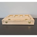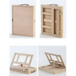 Kuferek wykonany jest z wytrzymałego drewna i zawiera sztalugę ułatwiającą malowanie. Wszystkie narzędzia i akcesoria są uporządkowane tak, by były łatwo dostępne i dobrze chronione podczas przenoszenia.