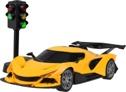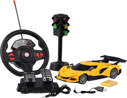 Przeżyj realistyczne wyścigi z tym sportowym autem RC z zestawem kierownica + pedały oraz działającą sygnalizacją świetlną. Futurystyczny pojazd z niskim zawieszeniem, tylnym spoilerem i przednimi światłami oferuje świetną przyczepność dzięki gumowym oponom. Sterowanie jest intuicyjne – kierownicą zmieniasz kierunek, a pedały służą do przyspieszania lub cofania. Ładowany akumulator obniża koszty eksploatacji.