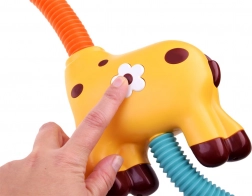 Wystarczy zanurzyć dolną część z pompką w wodzie i nacisnąć przycisk w kształcie kwiatuszka – z pyszczka żyrafy popłynie delikatny, przyjemny dla dzieci strumień.