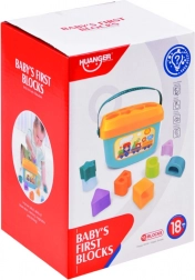 Żółta pokrywka z wycięciami zachęca dzieci do dopasowywania właściwych kształtów. Wspiera logiczne myślenie i precyzję ruchów.