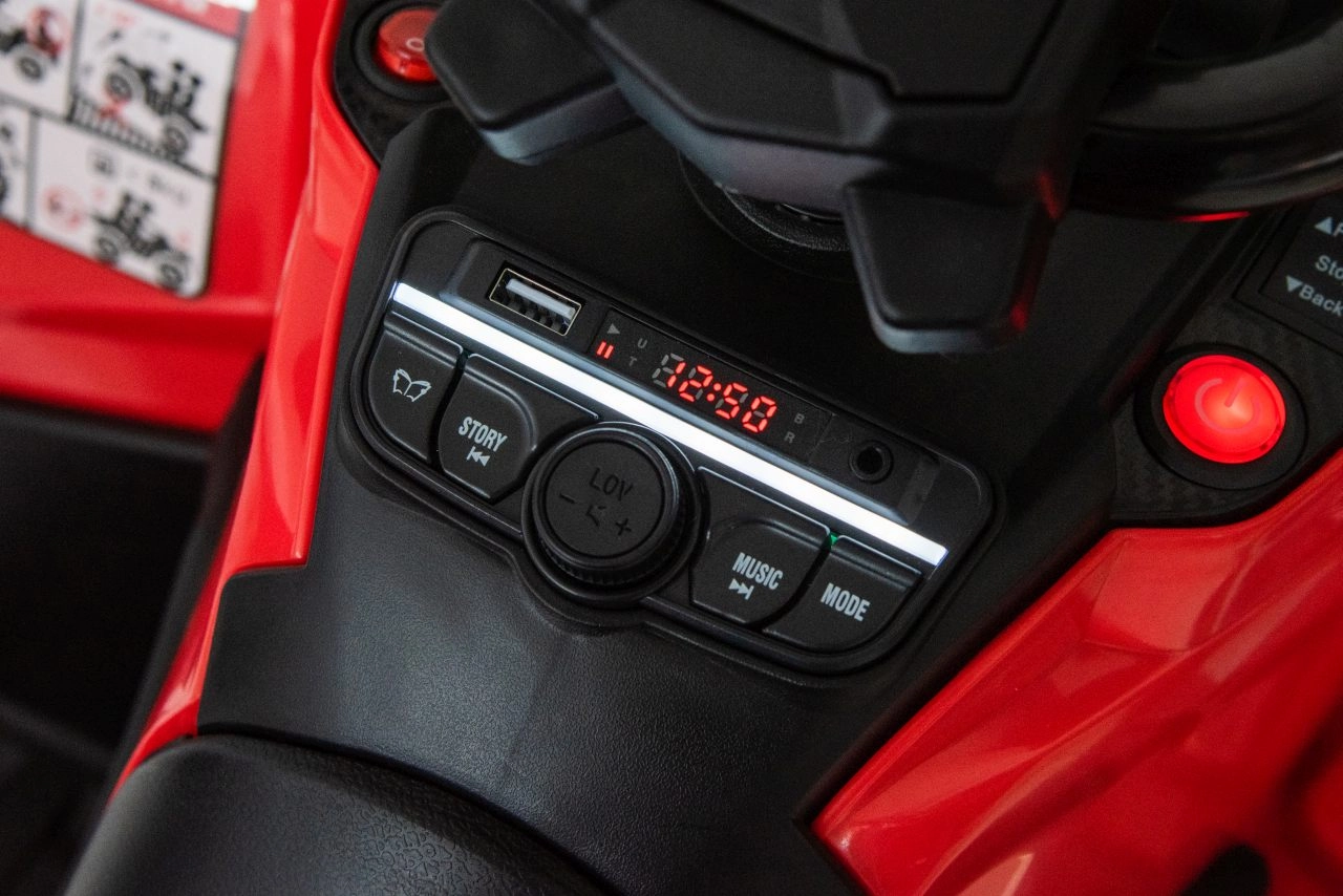 Dzieci mogą cieszyć się ulubioną muzyką dzięki panelowi audio z MP3, radiem FM, Bluetooth i innymi funkcjami. Bezpieczeństwo zapewnia wentylowane siedzisko z ekoskóry z pasami bezpieczeństwa. Konstrukcja pozwala na obciążenie do 50 kg.