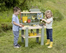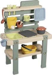 Ta wytrzymała zewnętrzna kuchnia w naturalnych kolorach oferuje dzieciom autentyczną przestrzeń do zabawy i eksperymentowania z wodą, piaskiem i materiałami naturalnymi. Wyjmowane boxy ułatwiają przenoszenie i sprzątanie, a kranik z obrotowym zaworem pomaga dozować wodę i rozwija małą motorykę.