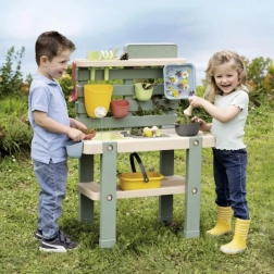 W zestawie znajduje się 15 praktycznych akcesoriów (sitko, koszyk, czerpak, grabki, łopatka itp.), półeczki odkładcze, haczyki oraz pokrywa zasobnika do ukrywania i przechowywania „skarbów”. Konstrukcja z wysokiej jakości plastiku z ochroną UV jest trwała kolorystycznie i gotowa do użytkowania na zewnątrz.