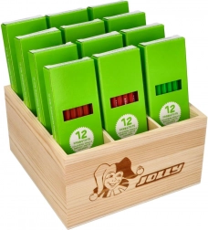 - Kolorowe kredki są umieszczone w stylowym drewnianym pudełku
