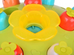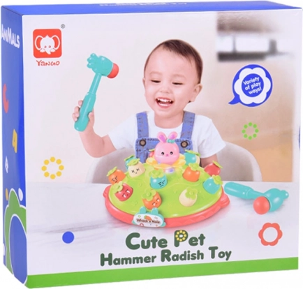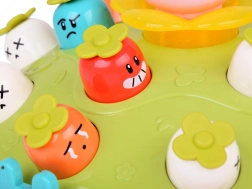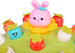Zabawa jest nie tylko wizualna i słuchowa, ale także motoryczna. Dziecko może obserwować, jak jego uderzenia młotkiem wpływają na zachowanie poszczególnych postaci. Do dyspozycji jest bezpieczny młotek z miękkim zakończeniem. Po zakończeniu zabawy młotek można schować do wyznaczonego otworu obok marchewek.