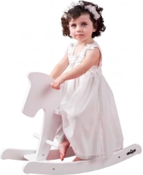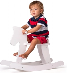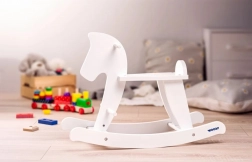 Odkryj ponadczasową klasykę do pokoju dziecięcego: biały drewniany konik na biegunach, który łączy radość z ruchu ze wsparciem naturalnego rozwoju. Kołyszący ruch pomaga rozwijać równowagę, koordynację oraz motorykę dużą, a niska wysokość siedziska (ok. 28 cm) dodaje dzieciom pewności podczas pierwszych przejażdżek.