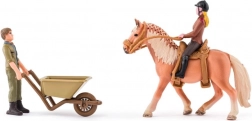 Figurka jeźdźca na koniu, rolnik z taczką oraz praktyczne narzędzia wprowadzają do zabawy więcej scenariuszy i wspierają rozwój wyobraźni oraz motoryki małej.
