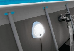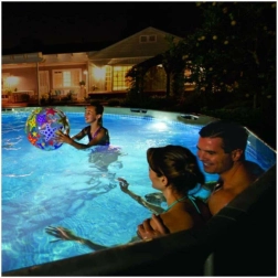 Lampa jest kompatybilna z większością basenów naziemnych i składanych, a swoją mocą pokrywa długość do 7,32 m. Wytrzymała i wodoszczelna konstrukcja, wiele trybów kolorów oraz prosta obsługa czynią ją idealnym dodatkiem do bezpiecznych i stylowych wieczornych kąpieli.