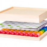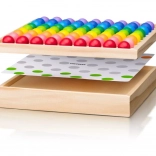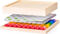Zestaw zawiera warstwowe karty z kolorowymi kropkami odpowiadającymi barwom kulek. Dzieci łatwo układają według nich obrazki, trenując precyzję i koncentrację.