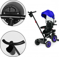 System 3w1 pozwala stopniowo zdejmować daszek, barierki i prowadnik rodzica – od trybu „trójkołowiec z prowadzeniem” aż po samodzielny tradycyjny trójkołowiec. Praktyczne wyposażenie obejmuje interaktywne światło z 4 melodiami i kolorowym podświetleniem, uchwyt na napój oraz 2 koszyki na akcesoria potrzebne na spacer.