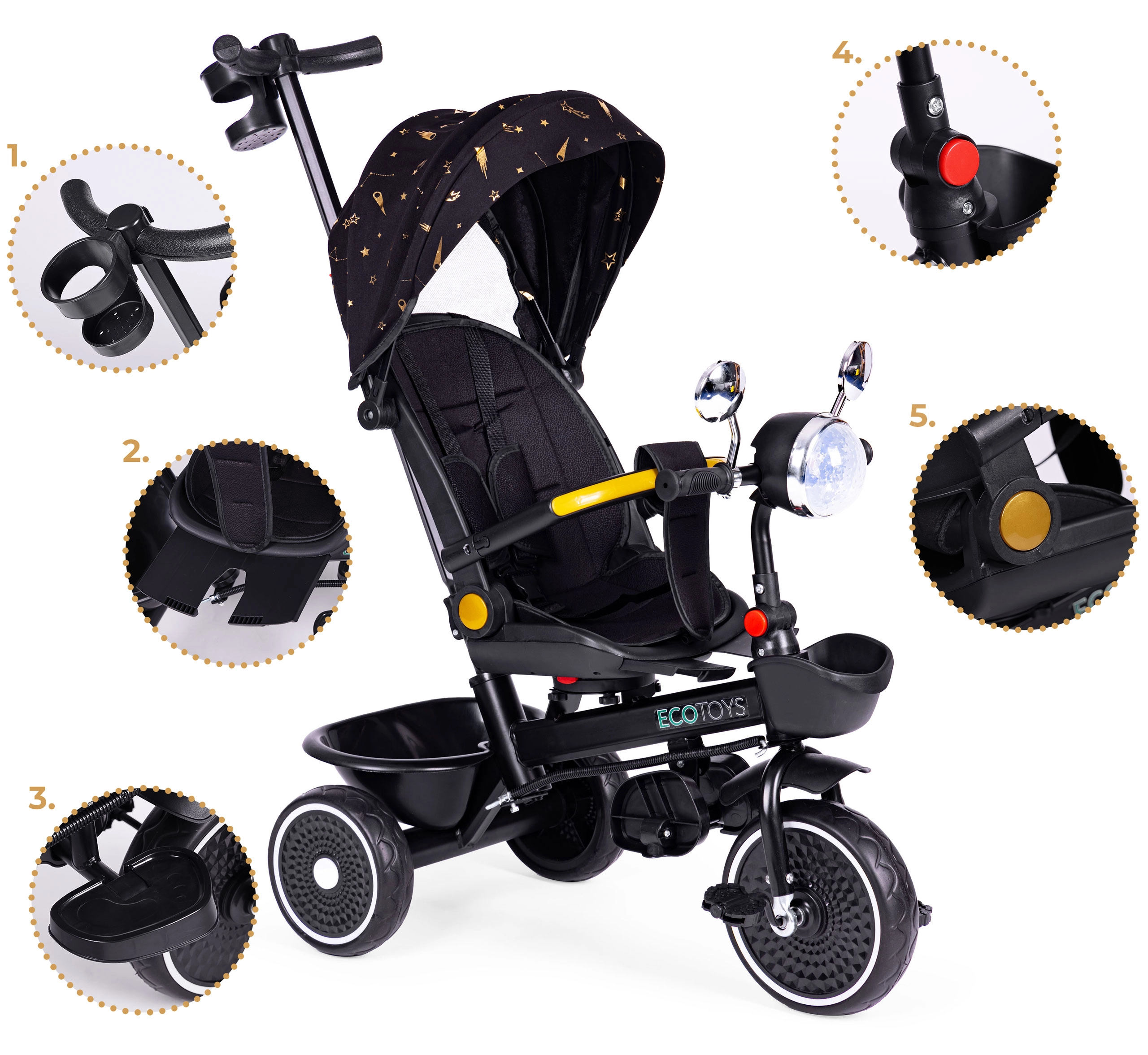 Wielofunkcyjny dziecięcy trójkołowiec ECOTOYS rośnie wraz z Twoim dzieckiem od 6 miesięcy do 6 lat. Oferuje obracane siedzisko 360°, prowadzącą rączkę dla rodzica, składaną budkę oraz pasy bezpieczeństwa i barierki. Dzięki wytrzymałej stalowej konstrukcji, kołom EVA i praktycznym dodatkom (lampka z melodiami, uchwyt na napój, koszyki na akcesoria) zapewnia wygodę, bezpieczeństwo i zabawę podczas każdego spaceru.