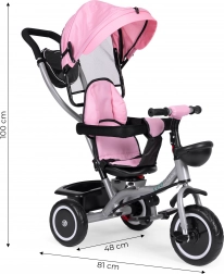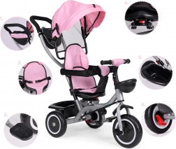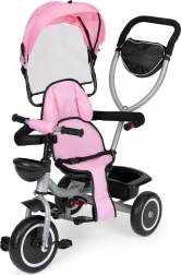 W zależności od wieku możesz łatwo zdejmować elementy (budkę, barierkę, rączkę prowadzącą) i dopasować trójkołowiec do umiejętności dziecka. Praktyczne koszyki i kieszeń na zamek pomieszczą zabawki, butelkę i drobiazgi w podróży.