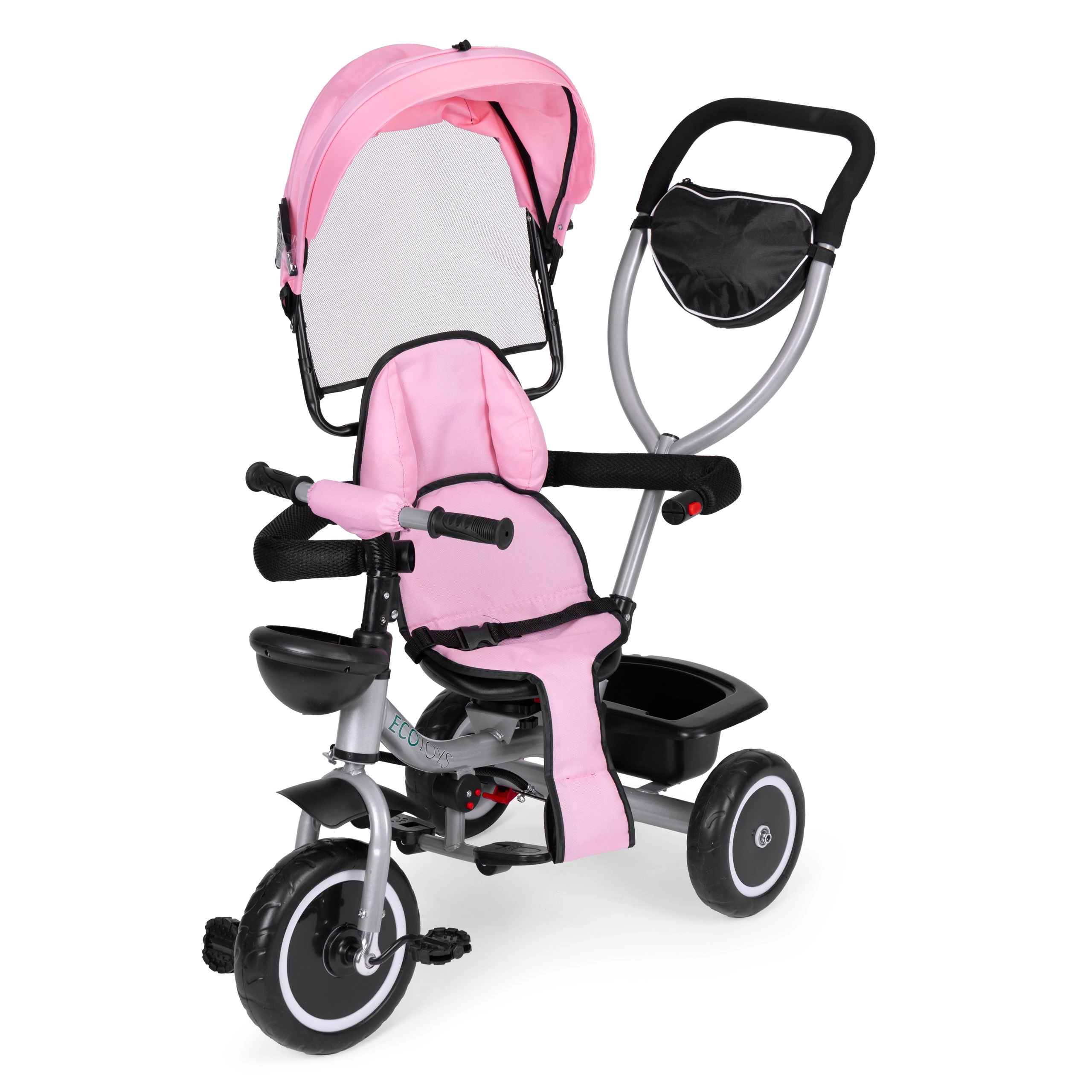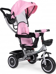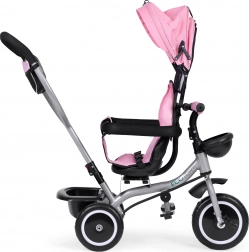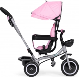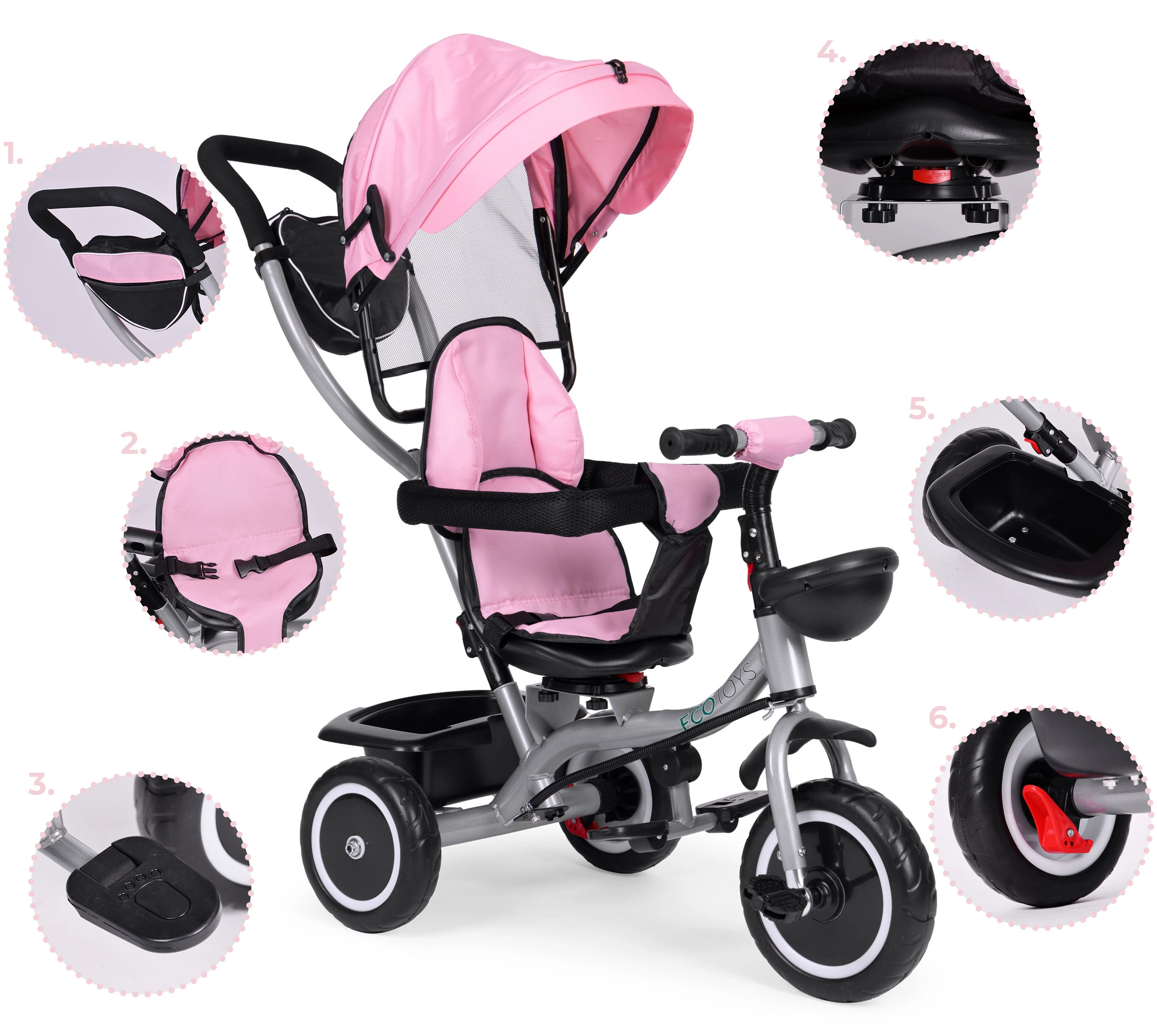 Ten multifunkcyjny trójkołowiec łączy wygodę wózka i radość z pierwszej jazdy. Dzięki obrotowemu siedzisku dziecko może jeździć przodem do rodzica lub w kierunku jazdy. Składana budka chroni przed słońcem, wiatrem i lekkim deszczem, a rączka prowadząca dla rodzica zapewnia pełną kontrolę nad kierunkiem.