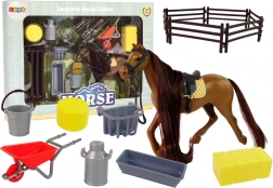 Taczki, wiadro, szczotka, siano, grabie, widły, pojemniki na karmę i wodę oraz zagroda – wszystko do realistycznej zabawy w stajnię.