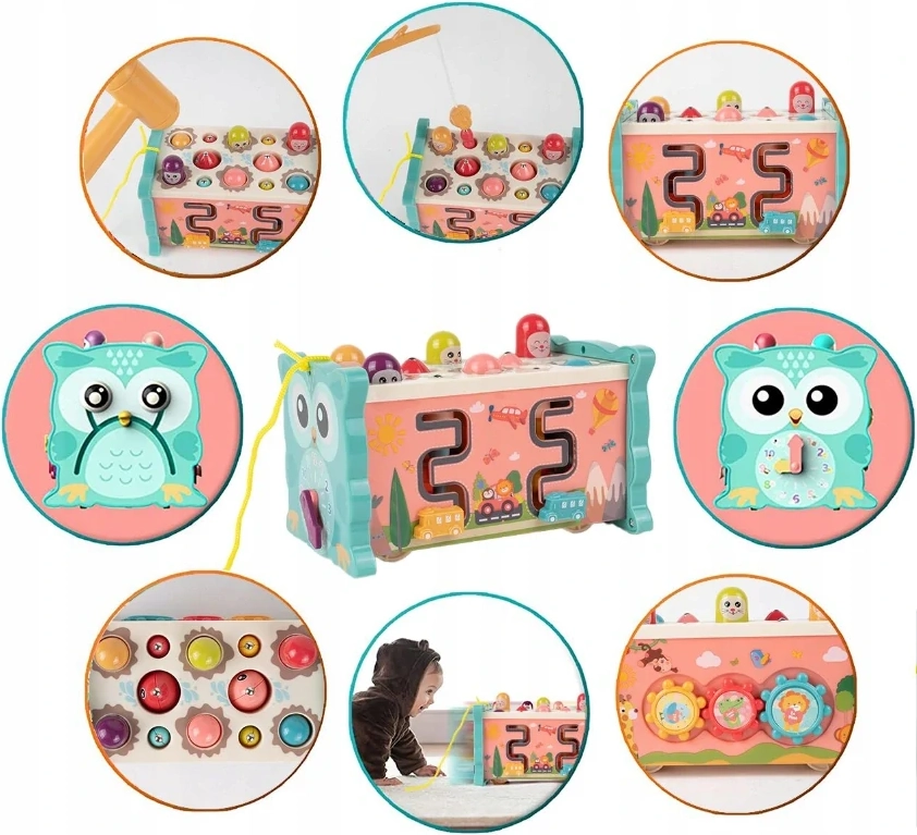 Kostka motoryczna 8w1 z motywem sowy oferuje wszechstronne możliwości zabawy, nauki i odkrywania. Pomaga rozwijać małą motorykę, cierpliwość i koncentrację dziecka dzięki ośmiu różnym aktywnościom.