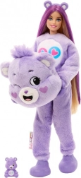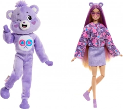 - Lalka Barbie w kostiumie, 5‑częściowy pluszowy kostium (przemiana w kurtkę), mini figurka CARE BEAR, spódniczka, opaska, okulary przeciwsłoneczne, buciki, grzebień z gąbeczką