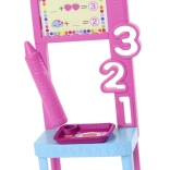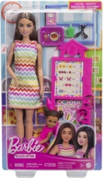 Ten zestaw zawiera lalkę Barbie ubraną w kolorową sukienkę w zygzakowaty wzór, podkreślającą jej kreatywność. Dzięki dołączonym akcesoriom, takim jak stojak nauczycielski z liczbami i tablicą, dzieci mogą w pełni wcielić się w rolę nauczycielki.