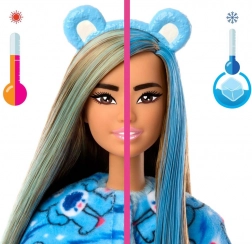 Po zdjęciu uroczej niebieskiej niedźwiedzicy ukazuje się stylowa lalka Barbie z ruchomymi stawami. Górną część kostiumu można odwrócić i przemienić w mięciutką modną kurteczkę, a niedźwiedzia głowa staje się legowiskiem dla mini misia. W opakowaniu znajdziesz akcesoria do ubierania i czesania, które zapewnią godziny zabawy.