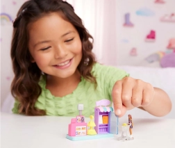 Mini laleczka BARBIE (ok. 3,5 cm) zgina się w pasie, może siedzieć lub pochylać się nad ladą i stoi na podstawce w kształcie serca, która pasuje do innych domków, pojazdów i zestawów serii MINI BARBIE LAND. Zabawa naturalnie rozwija wyobraźnię, motorykę małą oraz umiejętności społeczne.