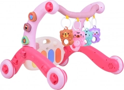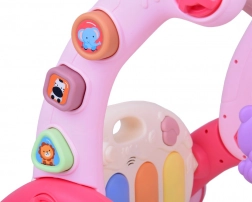 Szeroki rozstaw, gumowe kółka i poręczny uchwyt pomagają przy stawianiu pierwszych kroków. Sorter z pastelowymi klockami uczy rozpoznawania kształtów.