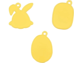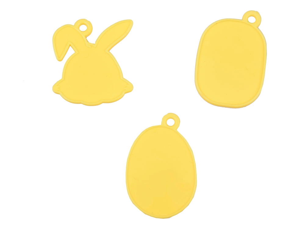 Trzy dwustronne zawieszki z wielkanocnymi motywami łatwo ozdobisz naklejkami – świetne jako drobne prezenty dla rodziny i przyjaciół.
