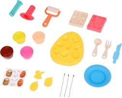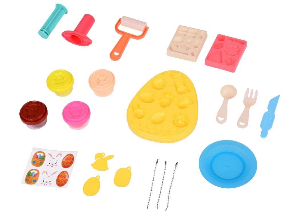 Nie brakuje praktycznych akcesoriów do realistycznej zabawy w pieczenie i nakrywanie do stołu: wałeczek, talerzyk, nóż, widelec i łyżeczka. Ręczny wytłaczacz tworzy z masy plastycznej zabawne kształty gwiazdek. Dzieci mogą ozdobić swoje wyroby naklejkami i przymocować do 3 dwustronnych zawieszek (główka króliczka, koszyczek, jajko) – idealne jako miłe prezenty.