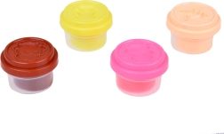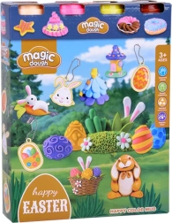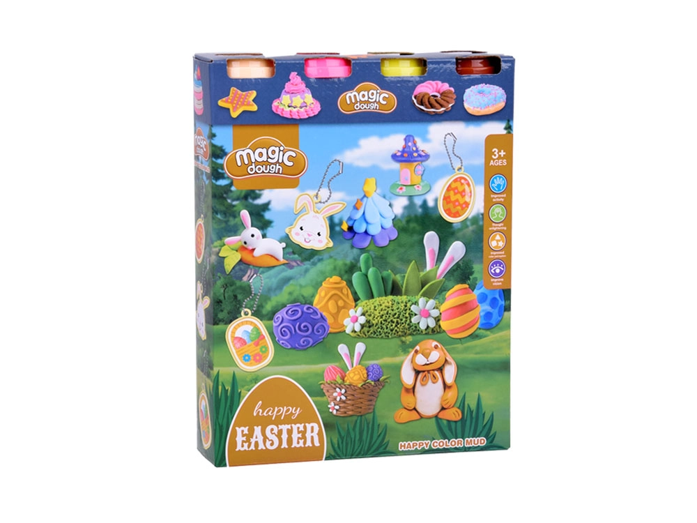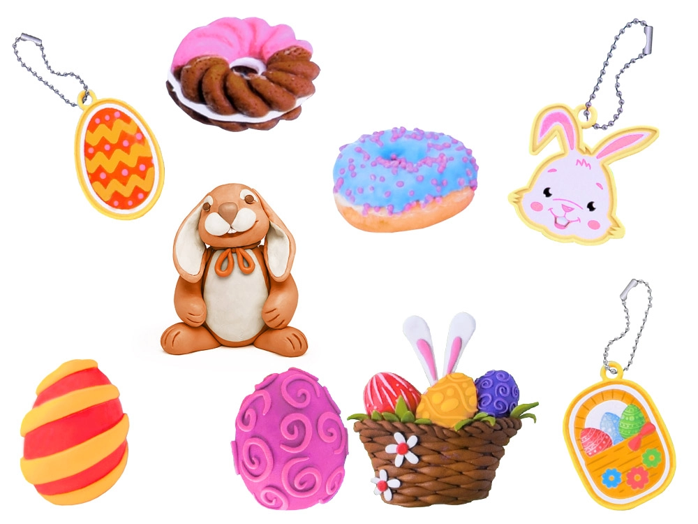 Ten kolorowy zestaw kreatywny dostarcza dzieciom wszystkiego, czego potrzebują do wykonania uroczych wielkanocnych ozdób. Dzięki 4 kubeczkom masy plastycznej i sprytnym wieczkom, które służą jako foremki ze zwierzątkami, w mgnieniu oka powstaną króliczki, kurczątka i zdobione pisanki. Duża foremka w kształcie jajka oferuje szeroką gamę motywów (króliczek, marchewka, jajka, kurczątko, koszyczek), a uzupełniają ją dwie dodatkowe formy z listkami, kwiatuszkami, chmurkami i słodkościami.