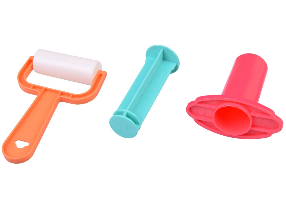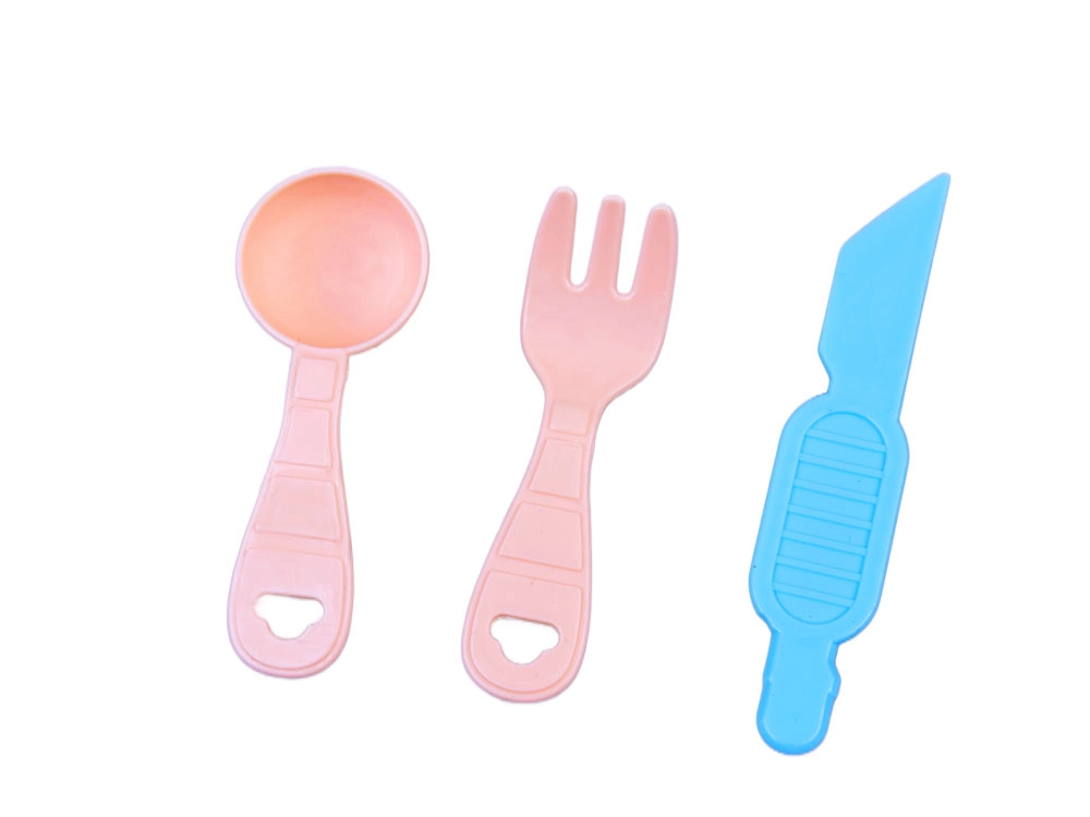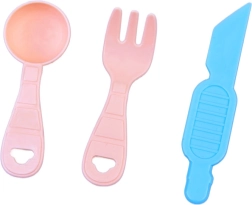 Wałeczek, talerzyk, nóż, widelec i łyżeczka wspierają zabawę w gotowanie oraz ułatwiają formowanie i serwowanie gotowych prac.
