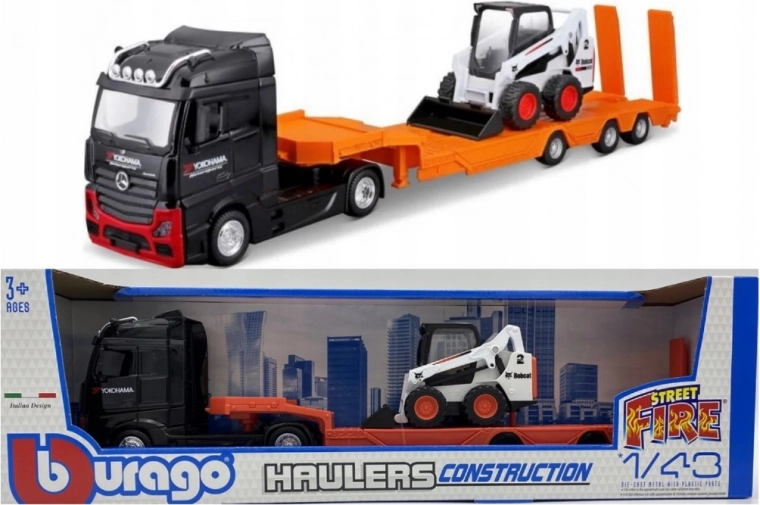 Odkryj szczegółowo wykonany metalowy zestaw ciężarówki marki Bburago. Ten model w skali 1:43 przedstawia Mercedes-Benz Actros Gigaspace w typowym wzornictwie do zastosowań budowlanych, uzupełniony o ładowarkę Bobcat. Idealny dla małych i dużych miłośników modeli pojazdów.