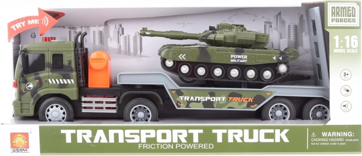 Wojskowa ciężarówka z czołgiem na baterie ze światłami i dźwiękami. Baterie AG13 w zestawie, odpowiednie od 3 lat. Świetny prezent dla małych miłośników techniki wojskowej.