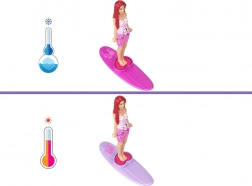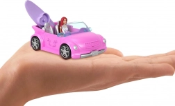 Samochodzik zmienia kolor w zimnej i ciepłej wodzie, a efekt można powtarzać wielokrotnie. Minilalka zgina się w pasie, dzięki czemu może siedzieć za kierownicą. Pojazd ma 2 siedzenia, więc łatwo rozszerzysz zabawę o kolejne figurki z serii (sprzedawane oddzielnie). Lalka ma podstawkę w kształcie serca, którą można przymocować do innych zestawów Mini Barbie Land.