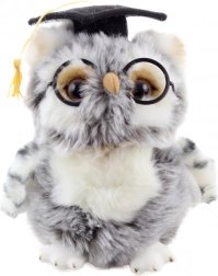 Ta sowa nosi czapkę absolwencką i okulary, co nadaje jej akademicki wygląd, idealny dla świętowania sukcesów.