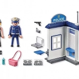 Szczegółowe stanowisko POLICE z wyposażeniem do przesłuchań, w tym stół, tablica i sprzęt, zapewnia realistyczne sceny i godziny zabawy.