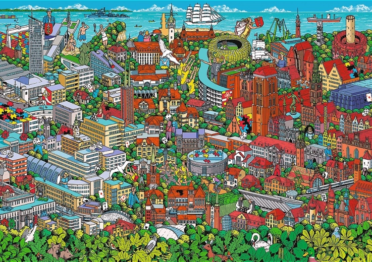Limitowana edycja puzzli TREFL Premium Plus Share the Moments: Trójmiasto prezentuje artystyczną ilustrację łączącą architekturę Trójmiasta z typowymi symbolami marki TREFL. Podczas układania odkryjesz figlarne detale, takie jak dachówki w kształcie puzzli czy koszykarze wpisani w miejskie scenerie.