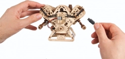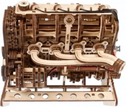 Model składa się etapami od bloku cylindrów po głowice i układ zaworowy, co zapewnia świetne doświadczenie edukacyjne. Nie brakuje detali, takich jak stylizowany układ wydechowy, świece zapłonowe, miska olejowa, bagnet oleju czy korki płynów. Montaż nie wymaga kleju ani specjalnych narzędzi – ruchome części wystarczy delikatnie przeszlifować i nasmarować woskiem (lub odpowiednim smarem). Dołączona jest szczegółowa instrukcja obrazkowa w 11 językach.