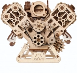 Drewniany mechaniczny model silnika V8 wiernie symuluje pracę prawdziwej V‑ósemki: osiem cylindrów z rytmiczną pracą tłoków, 16 zaworów sterowanych wałkami rozrządu, rozrząd z regulowanym łańcuchem (32 ogniwa) oraz osprzęt napędzany falistym paskiem. Dzięki zasilaniu przez USB‑C lub ręcznemu obracaniu doświadczysz realistycznych ruchów mechanicznych i lepiej zrozumiesz zasady działania silnika spalinowego.