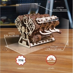 776 laserowo wycinanych elementów, stylizowane wydechy, świece zapłonowe i miska olejowa. Wystarczy przeszlifować i nasmarować woskiem dla płynnej pracy.