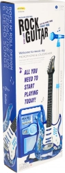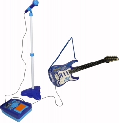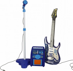 Zestaw obejmuje gitarę elektryczną, wzmacniacz oraz mikrofon na regulowanym statywie dla realistycznych wrażeń.