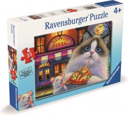 Świetne puzzle dla małych miłośników zwierząt i jedzenia! Ravensburger oferuje wesoły motyw kota z pizzą składający się z 35 elementów dla dzieci od 4 lat, wspierający rozwój motoryki małej i cierpliwości.