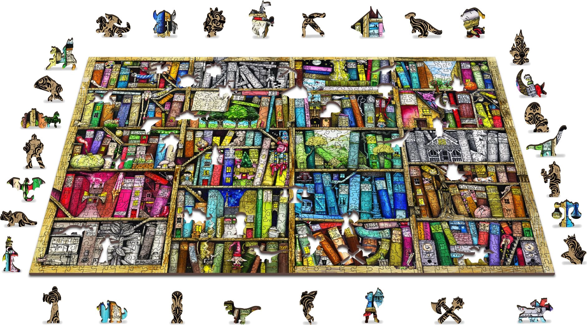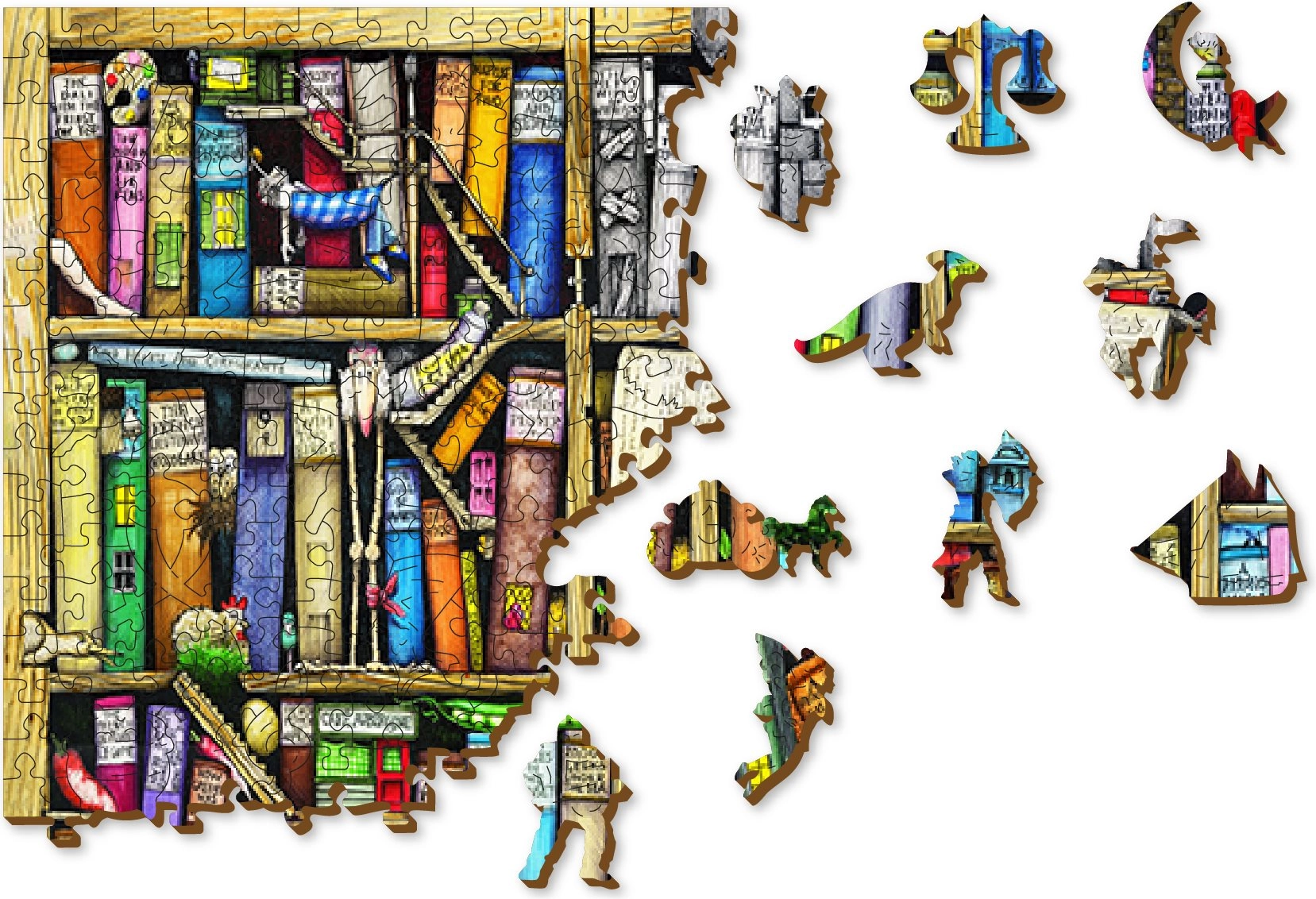 Wypróbuj zabawne i pełne wyzwań puzzle WOODEN CITY z motywem półek z książkami. Te drewniane puzzle są wycinane laserowo i oferują specjalnie kształtowane elementy, które zachwycają nie tylko oryginalnością, ale także precyzyjnie zaznaczonymi detalami.